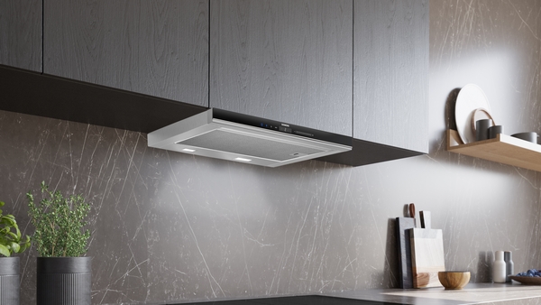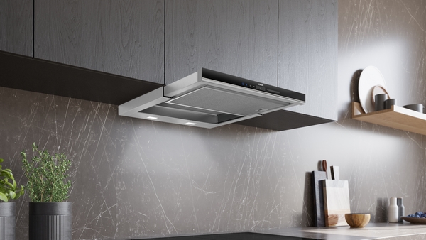 O exaustor telescópico integra-se na perfeição por baixo do móvel superior, ficando praticamente invisível.