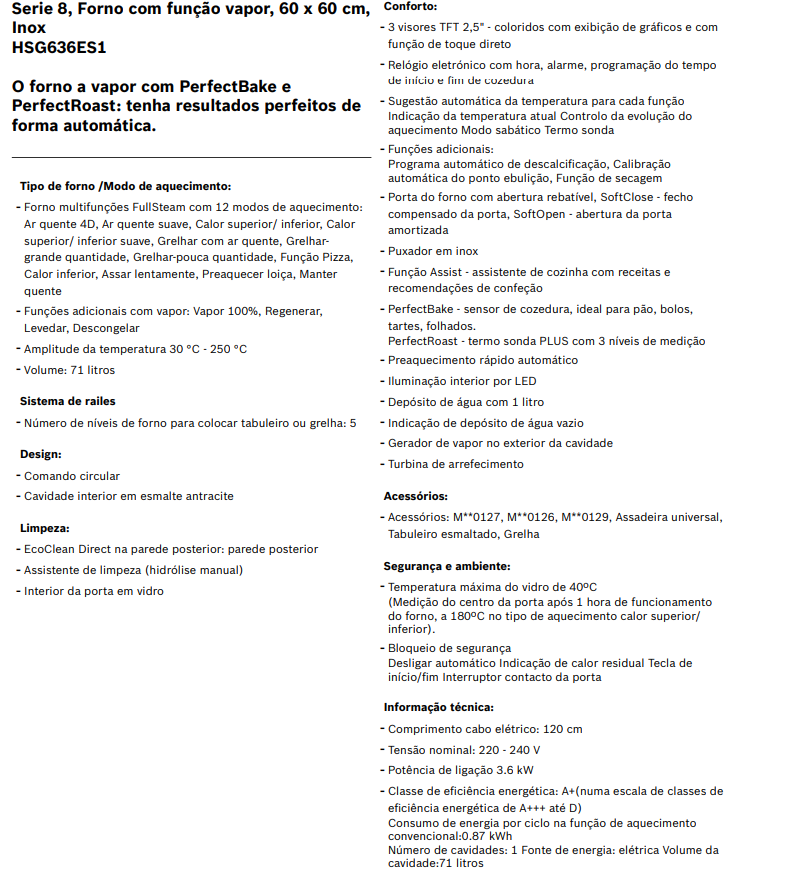 Modelo: BOSCH HSG636ES1 Capacidade: 71 L Classe energética: A+