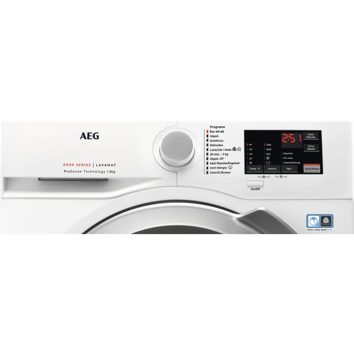 Máquina de lavar roupa AEG da Série 6000 ProSense de 8 kg e 1.200 rpm, painel de controlo branco e óculo silver, motor Inverter, tecnologia ProSense que poupa tempo, água e energia, com tambor Care.