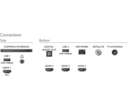 Outras conexões: Conector de Satélite; Interface comum mais (CI+); Saída de áudio digital (óptica); Ethernet-LAN RJ-45; Fone de ouvido; Conector de serviço