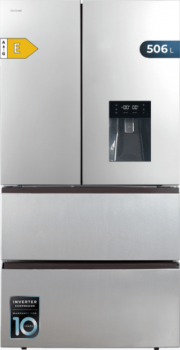 Bolero CoolMarket FD 510 WD Inox E Frigorífico 4 portas Inox estilo francês, com 510 litros de capacidade, 185 cm de altura, 85 cm de largura, com dispensador de água, classe E e Motor Inverter Plus. Além disso, tem diferentes modos com Fast Cooling e Fast Freezing, assim como sistemas como Multi Air Flow, Total No Frost, Metal Cooling.