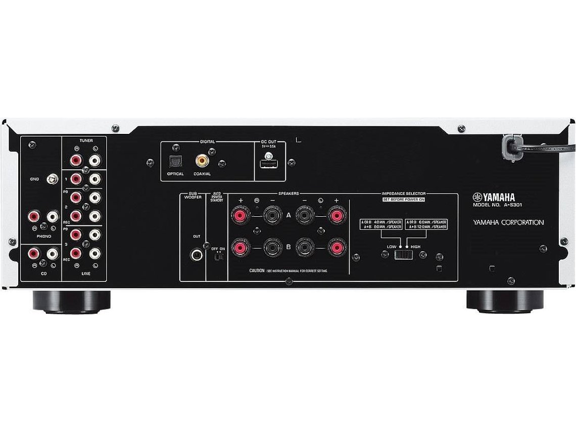 O amplificador estéreo Yamaha A-S301 prateada oferece excelente qualidade de som e definição, independentemente de qual seja a fonte de reprodução, graças à potência máxima de 60 W + 60 W RMS e à conceção dos circuitos áudio ToP-Art de forma simétrica, simples e direta, evitando interferências desnecessárias no sinal. Os componentes de grande qualidade também asseguram que o som seja o mais nítido possível. O painel de conexões do amplificador Yamaha A-S301 integra cinco entradas de áudio RCA em sinal de linha, uma entrada de sinal phono especificamente para a ligação de um gira-discos, uma entrada ótica e uma entrada coaxial. A porta USB DC Out, também presente no painel, possibilita a conexão com o dispositivo Yamaha YBA-11, conferindo conectividade Bluetooth ao amplificador para mais possibilidades de reprodução (dispositivo vendido em separado). Outras características: modo Pure Direct; regulação de frequências graves e agudas; controlo de panorâmicas; regulação de efeito Loudness; saída de áudio para subwoofer; capacidade para a alimentação de dois pares de colunas em simultâneo ou alternadamente; frequência de resposta de 10 Hz a 100 kHz; comando à distância.